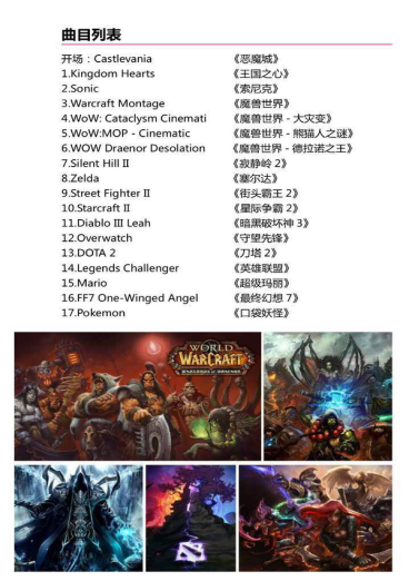 整场演出由《恶魔城》开场,当音乐响起,引起阵阵欢呼,随着音乐、灯光、视频的律动,很快进入神奇的游戏世界。一曲结束,在观众的欢呼声中VGL创始人Tommy Tallarico登场向全场致意,并隆重介绍本场演出两大重量级指挥——暴雪娱乐音乐总监Russell Brower、爱尔兰著名作曲家、指挥家Eimear Noone。