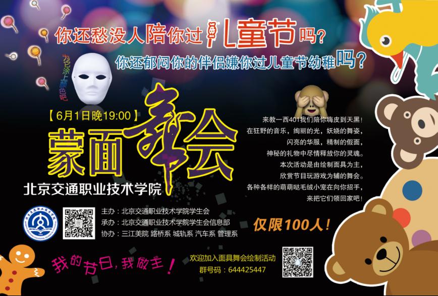 2017年6月1日儿童节到来之际,beat365vip官网登录入口举办了主题为“寻找像你一样的人”的假面舞会。本次舞会由院团委主办,院学生会信息部承办,学院路桥系,轨道交通系,汽车系,管理系及三江美院学生会协办。此次活动的目的是为了丰富校园生活,展现大学生风采,促进同学之间的交流,为同学们搭建了一个互相交流的平台,培养同学们的社交能力,更加完善自我,为大家带来一个快乐难忘的夜晚。