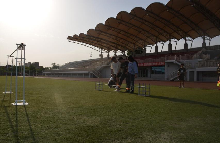 本次比赛主要考验参赛选手之间的默契程度,三人为一组,用绑带将踝关节部位两两捆绑在一起后出发,经过四个环节后到达终点所用时间最短者获胜。比赛的第一环节为高低杠,选手需跨过低杠并钻过高杠;第二环节为跳绳,选手站定好示意后跳过一下即可;第三环节为弧形跑道,在不碰倒水瓶的情况下走过跑道;第四环节同第一环节。每队选手都保持紧密的协同动作,很好的展示了团队精神。最终,管理系1队以最快的时间荣获本次比赛冠军,路桥系1队不甘示弱夺得亚军,汽车系1队荣获季军。