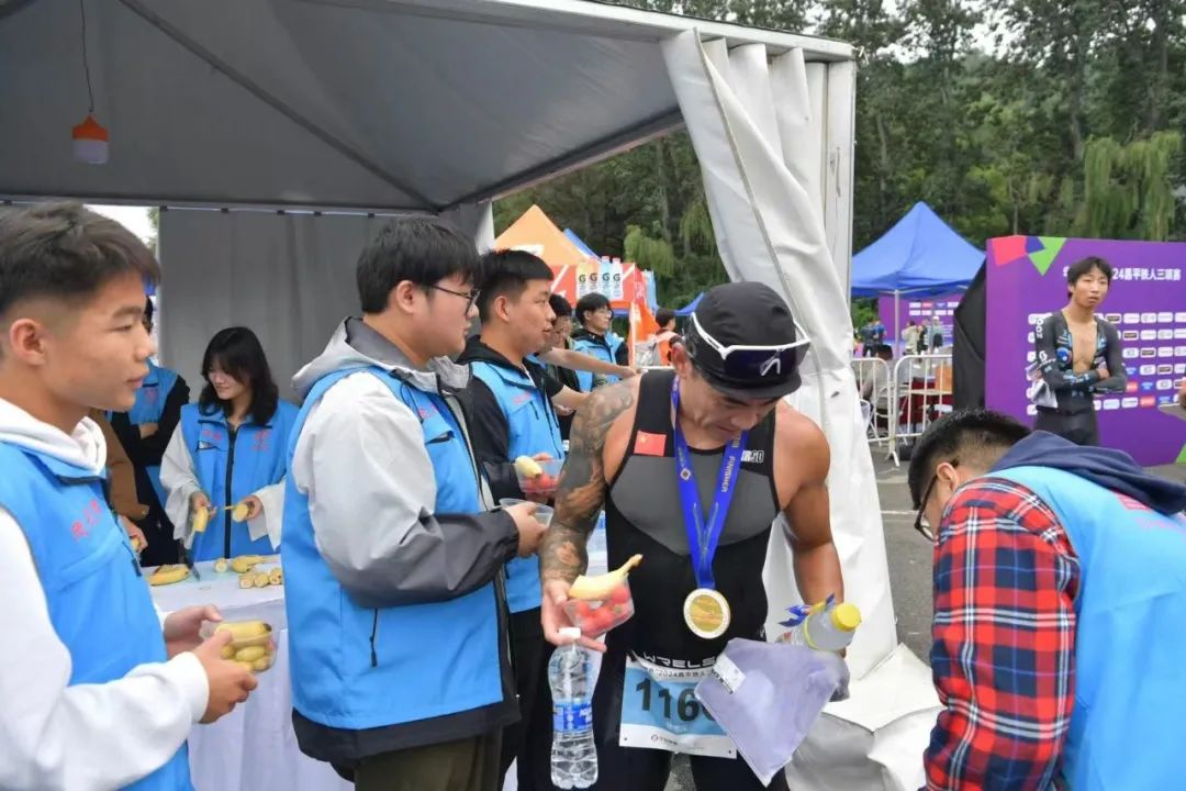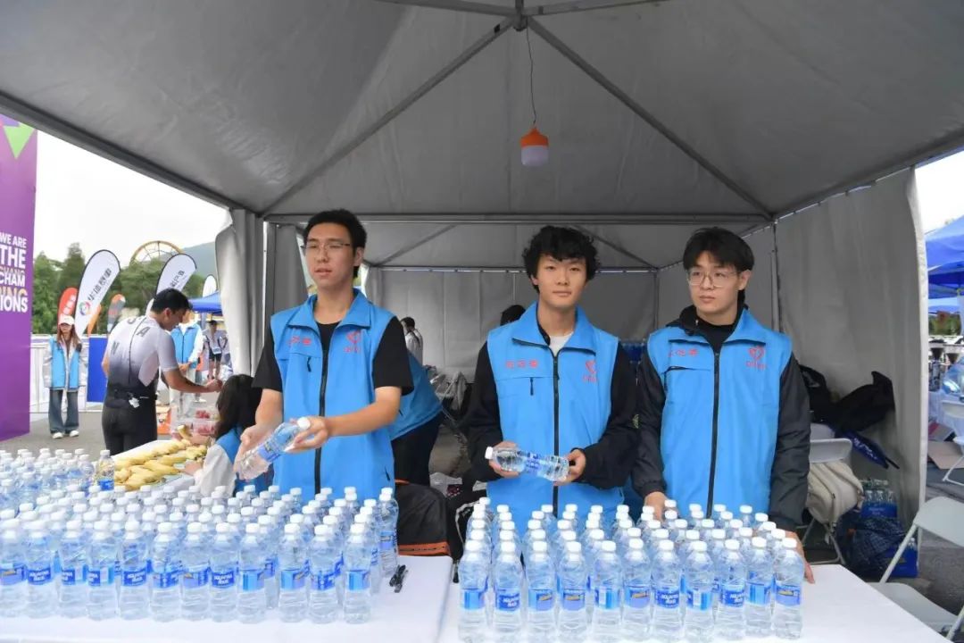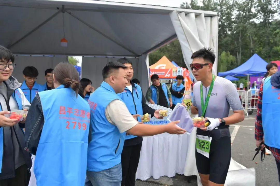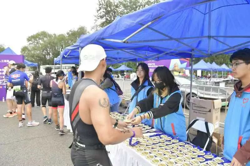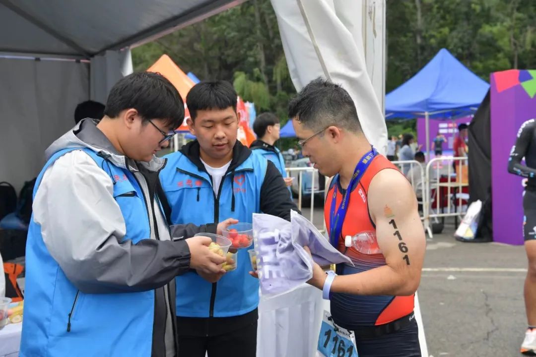 赛事当天,在出发起点,志愿者们为运动员们进行赛前检录;在自行车转换区域,志愿者们为选手提供方向指引;在赛事终点,志愿者们搬运摆放补给品,并向完赛选手进行发放;在比赛中,志愿者们热情地为选手呐喊助威,及时协助工作人员对体能不支的选手开展帮扶和救助,他们用言语和行动向参赛选手们提供最有力的支持和鼓励。志愿者们细致专业的服务获得了参赛选手的一致好评。