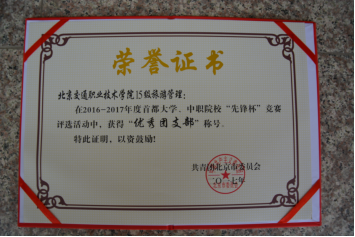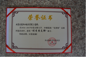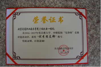 为全面贯彻党的十八大和十八届三中、四中、五中、六中全会精神,深入学习贯彻习近平总书记系列重要讲话精神,深化共青团改革,着力推进基层组织建设,推动首都大学、中职院校共青团系统工作,在首都高校青年团员中选树典型、表彰先进、推广经验,在2016——2017年度首都大学、中职院校“先锋杯”的评比表彰中,我院15道桥团支部、15级机电一体化团支部和15级旅游管理团支部被授予“2016——2017年度首都大学、中职院校‘先锋杯’优秀团支部”荣誉称号。