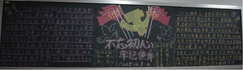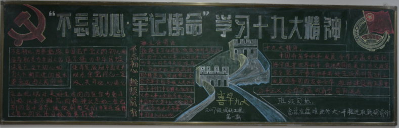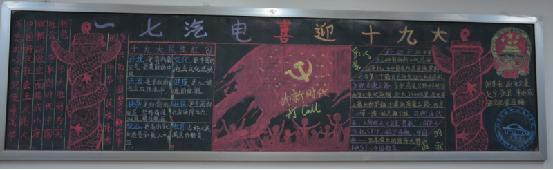 一张张设计风格各具特色的黑板报呈现在大家的眼前。本次活动是使用晚自习教室内的后黑板宣传党的十九大精神为主要内容,共有18个团支部积极行动,精心设计,用绚丽的粉笔精心制作了一张张图文并茂的黑板报,紧密结合实际,从多方面、多角度帮助同学们深刻领会、全面把握党的十九大精神,引导团支部宣传爱党、爱祖国,树立永远跟党走的决心。进而勤奋学习,立志早日成为祖国合格的建设人才。