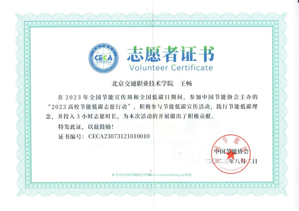 在此期间,王畅同学以节能低碳为主题创作了平面设计作品,并投入3小时志愿时长,荣获本次活动“校园节能宣传先锋”荣誉证书以及“志愿者证书”。