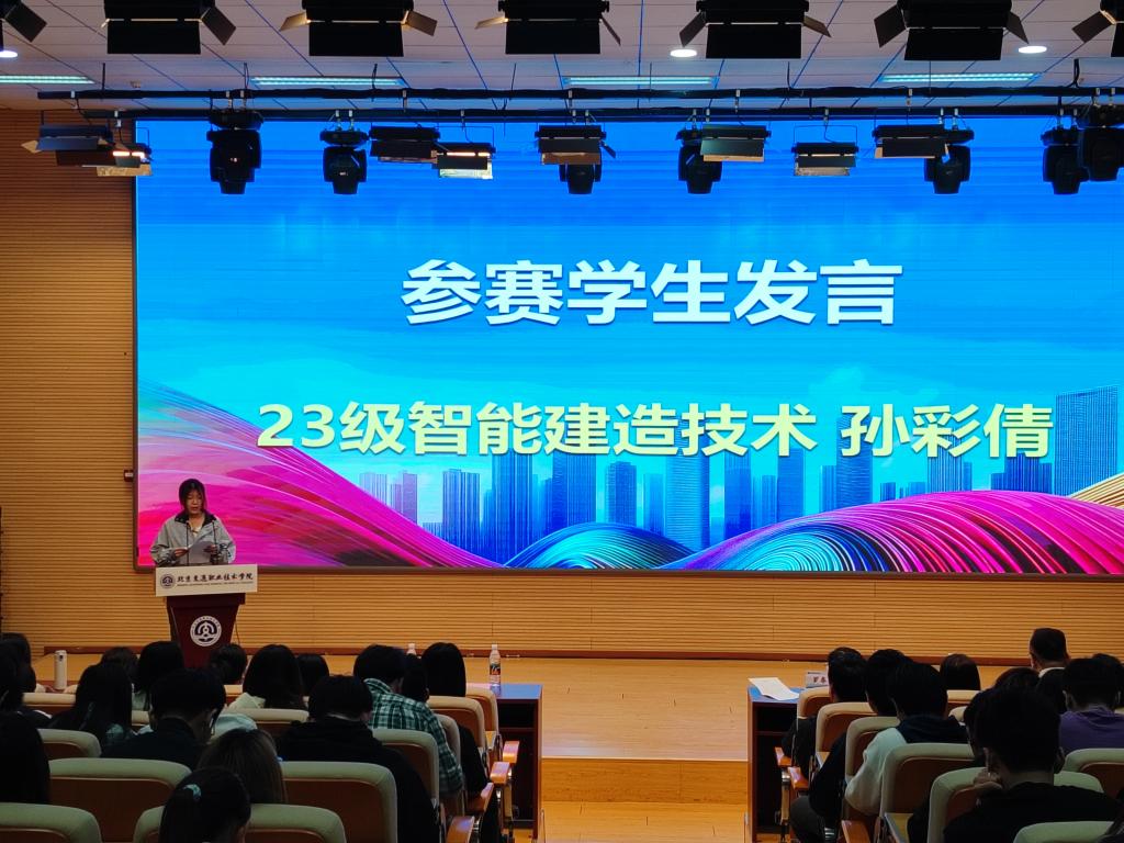 23级智能建造技术专业的孙彩倩同学作为参赛学生代表进行发言。她坚定地表示:"成长没有捷径,唯有在荆棘丛生的奋斗征程中直面困境、突破自我设限的边界,才能蜕变出更加坚韧的闪光人格。"全体参赛学生将以主人翁姿态主动迎接赛事挑战,以昂扬的精神状态投入比赛,在突破自我的过程中淬炼品格,用无畏的勇气诠释工匠精神。