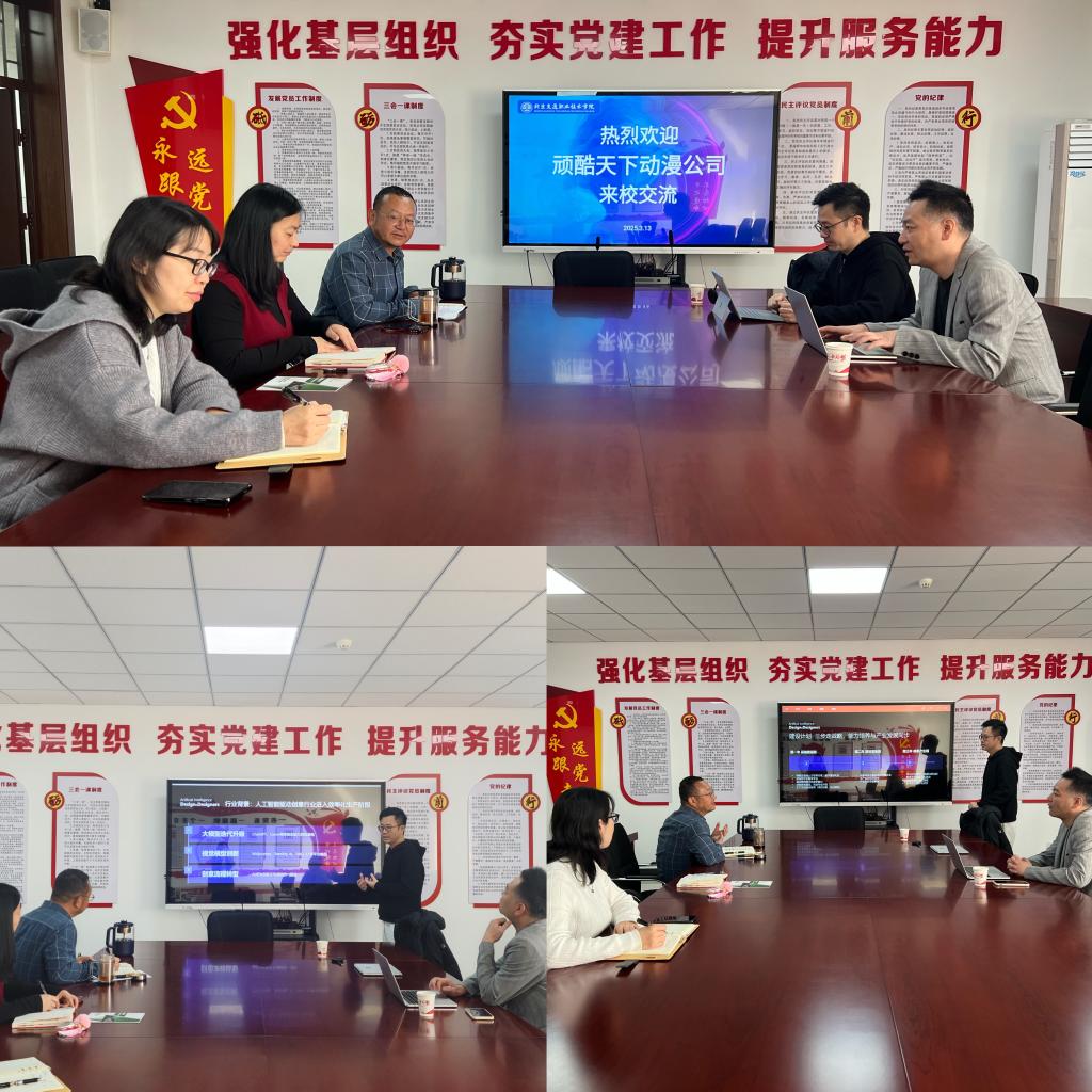 2025年3月13日上午,北京顽酷天下网络科技有限公司与杭州水母智能科技有限公司一行莅临我院路桥系,就校企合作、产教融合等议题展开深入交流。路桥系主任杨文生及数字媒体专业教师团队热情接待企业代表,双方围绕动漫设计专业建设、AI技术应用及产教融合等议题展开了广泛探讨。