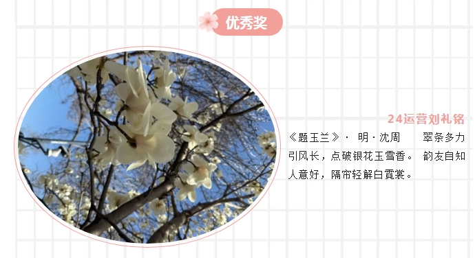 为深入贯彻落实德智体美劳“五育并举”育人理念,激发青年学子传承文化、创新实践的热情,轨道交通系于4月3日至14日成功举办“春日诗韵映繁花”春日花卉摄影与诗句融合大赛。活动以“撷春日繁花光影,品千年诗意芳华”为主题,通过镜头与诗句的碰撞,展现当代青年的文化自信与艺术创造力。