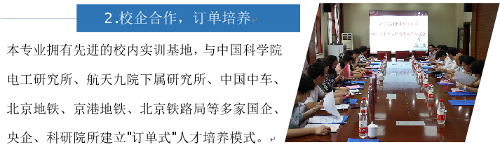 本专业拥有先进的校内实训基地,与中国科学院电工研究所、航天九院下属研究所、中国中车、北京地铁、京港地铁、北京铁路局等多家国企、央企、科研院所建立"订单式"人才培养模式。