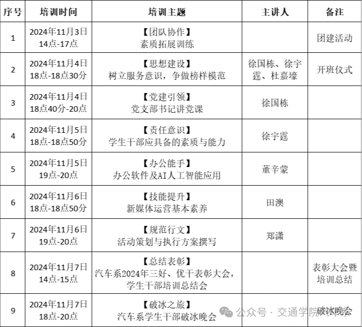为了全面提升汽车系学生干部的综合素养,培养学生干部的纪律性、规范意识和责任感,增强学生干部在组织管理、团队协作等方面的专业技能,以及培育符合新时代需求的“专精多能”人才,结合系部工作实际,特别策划并开展一期学生干部综合素质提升培训班。此次培训不仅注重能力的提升,也强调纪律的遵守、规范的执行和职责的明确,旨在打造一支既专业又守纪的学生干部队伍,为未来的学习和工作奠定坚实的基础。