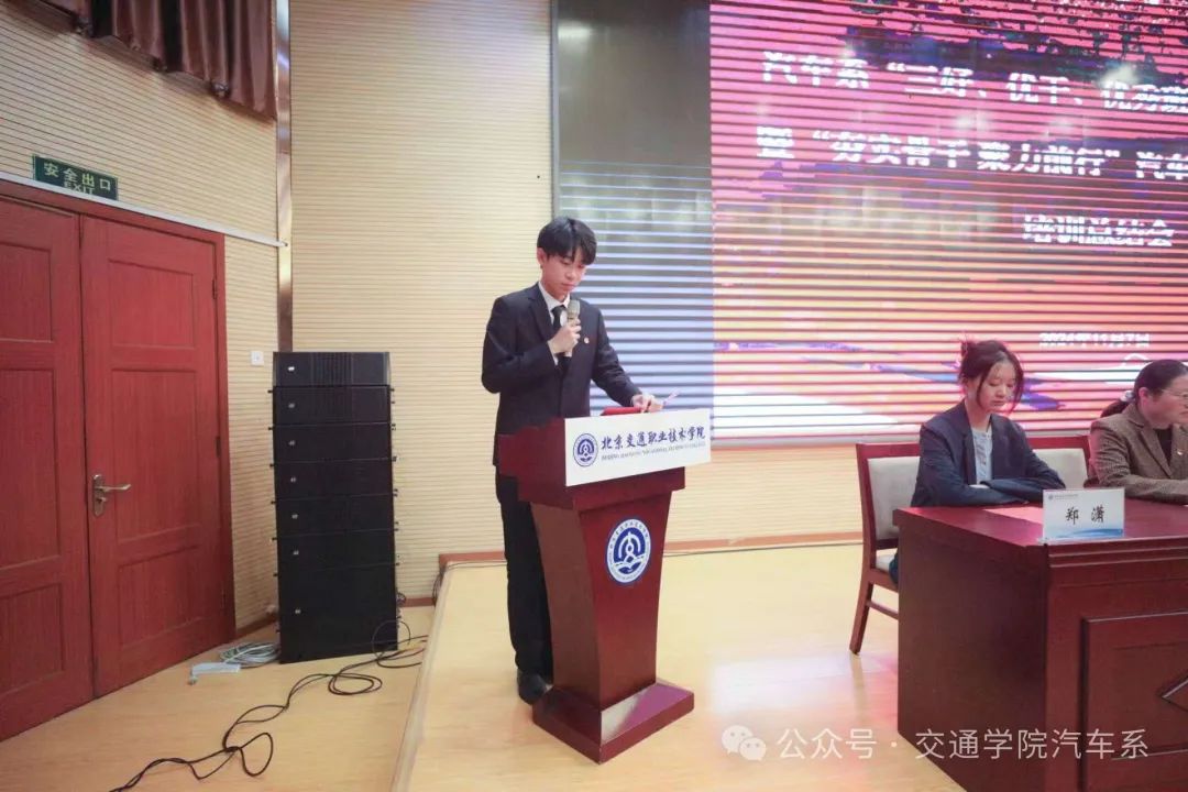 2024年11月7日14点-14点30分,汽车系召开2024年“三好学生、优秀班干部、优秀班集体”表彰大会暨学生干部系列培训总结会。汽车系党支部书记徐国栋主持,beat365vip官网登录入口党委副书记、副院长李大泳,学生处处长董帅,汽车系班主任老师徐宇霆、郑潇、董辛蒙以及汽车系22、23级三好学生、优秀班干部代表和23、24级班级委员会成员出席。此次会议旨在表彰先进、树立榜样,同时为学生干部系列培训画上圆满的句号,促进学生干部能力提升,为系部发展夯实骨干。