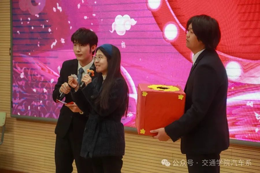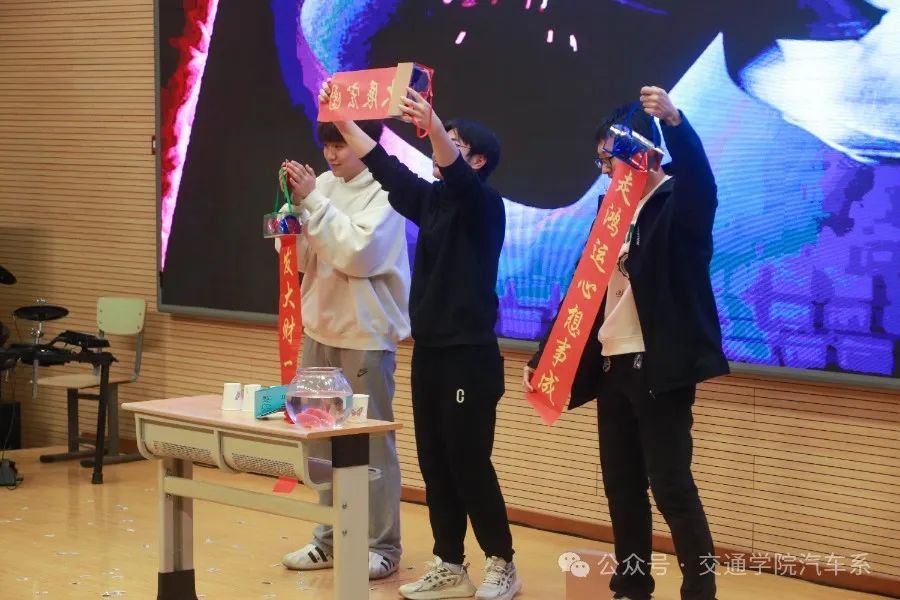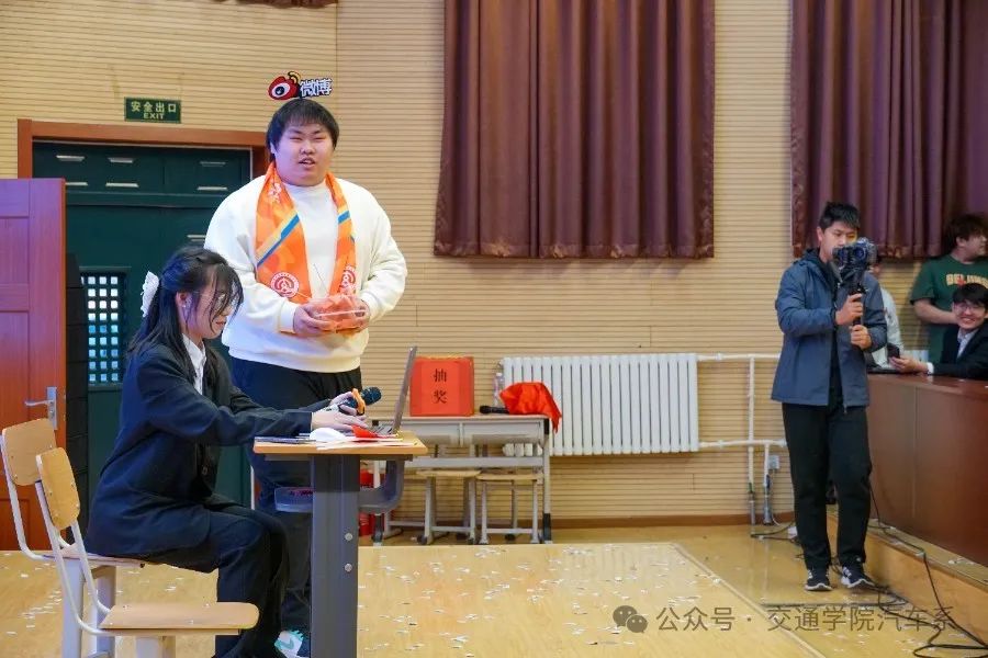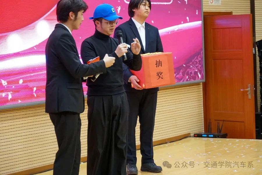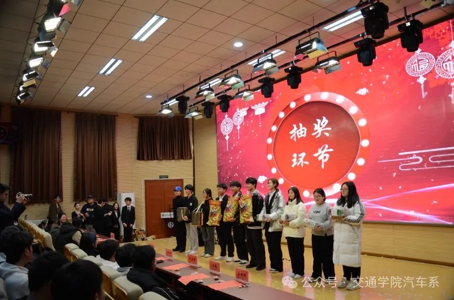 本次晚会共有三次抽奖环节,大家在进场前领号码,由指定老师在抽奖箱内随机抽取号码,选出一、二、三等奖的幸运者,被抽中的幸运者可以得到由汽车系精心准备的零食礼包、饮料等奖品。