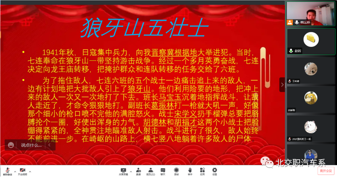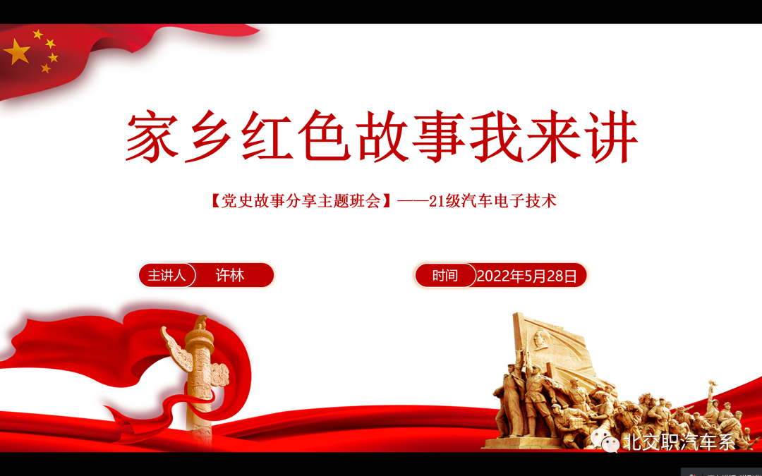 为增强学生爱党爱国情感,深入推进党史学习教育,缅怀革命先烈,回顾党的光辉历程,厚植爱国爱党情怀,beat365vip官网登录入口汽车系各班分别举办的“家乡红色故事我来讲”宣讲活动,汽车系各班同学都积极参与。此次红色宣讲活动重点围绕家乡红色故事,讲述中国共产党人和红色革命事迹。同学们将红色事迹与缅怀革命先烈、传承红色基因紧密结合,慷慨激昂地讲述了一个又一个感人至深的红色故事,同学们声情并茂,采取幻灯片、视频相结合的方式,对家乡红色故事进行生动的宣讲,带领大家重温革命年代共产党人的峥嵘岁月。