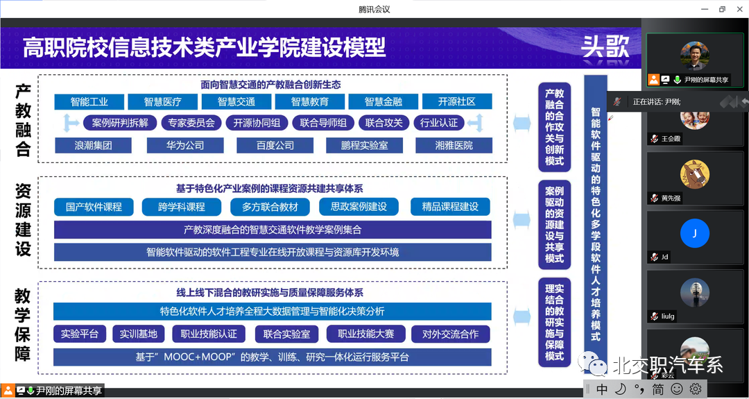 会上,刘主任简要介绍了我系计算机相关专业发展现状以及目前课程建设进展。随后,尹刚主任针对高校特色化课程与专业建设教学体系创新与应用展开讲解,重点讲解产教融合、专业建设、实践课程等内容,并演示头歌教学实验平台。