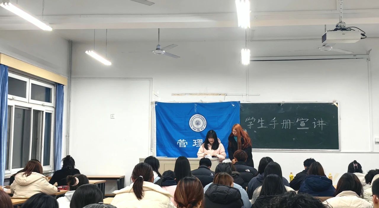 为加强新生对《学生手册》的了解,明确校规校纪,培养学生良好的行为规范和道德情操,2024年11月20日管理系于教一楼119教室召开2024级新生《学生手册》宣讲活动。