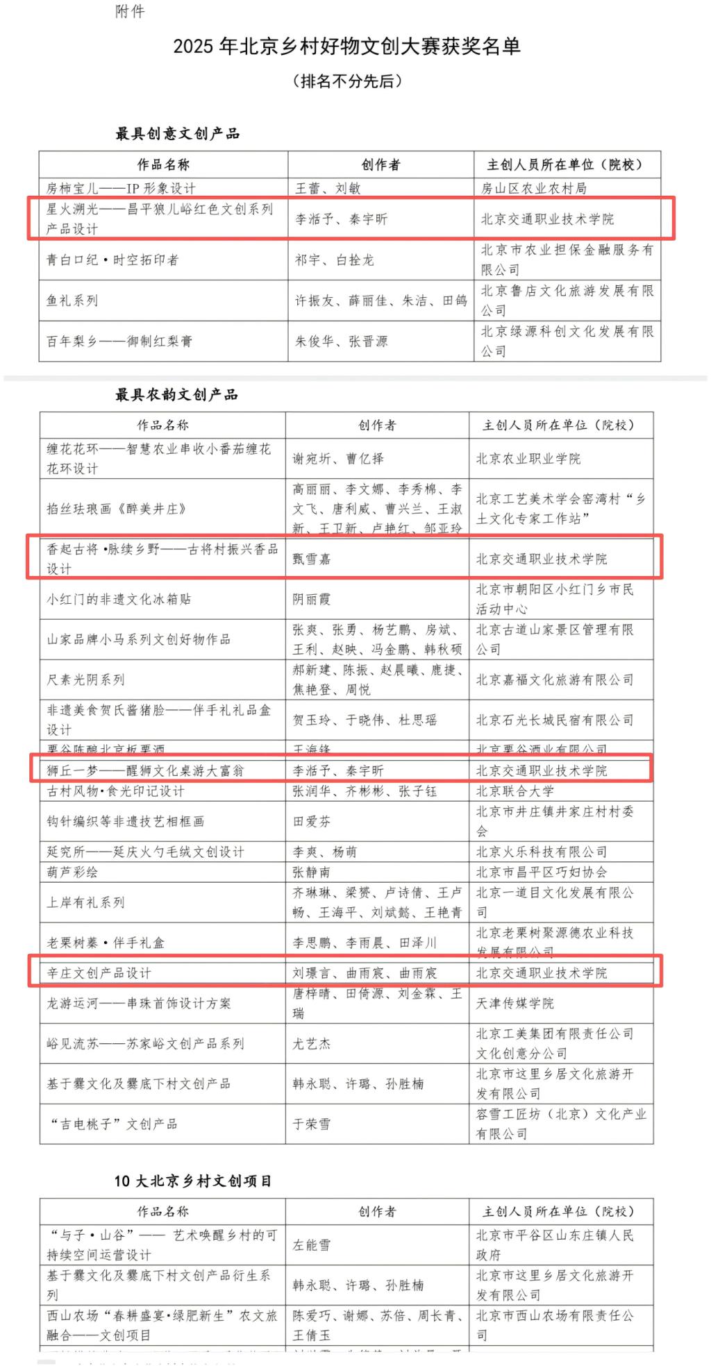 2025 年北京乡村好物文创大赛以 “挖掘乡村特色、激活文创活力、助力乡村振兴” 为目标,评选出的获奖作品涵盖了文化传承、农业衍生、红色文旅等多个领域,是对北京乡村文创发展成果的集中展示。此次获奖既是大赛组委会与专家评审对学子创意能力的高度认可,也是对我院人才培养模式的肯定。