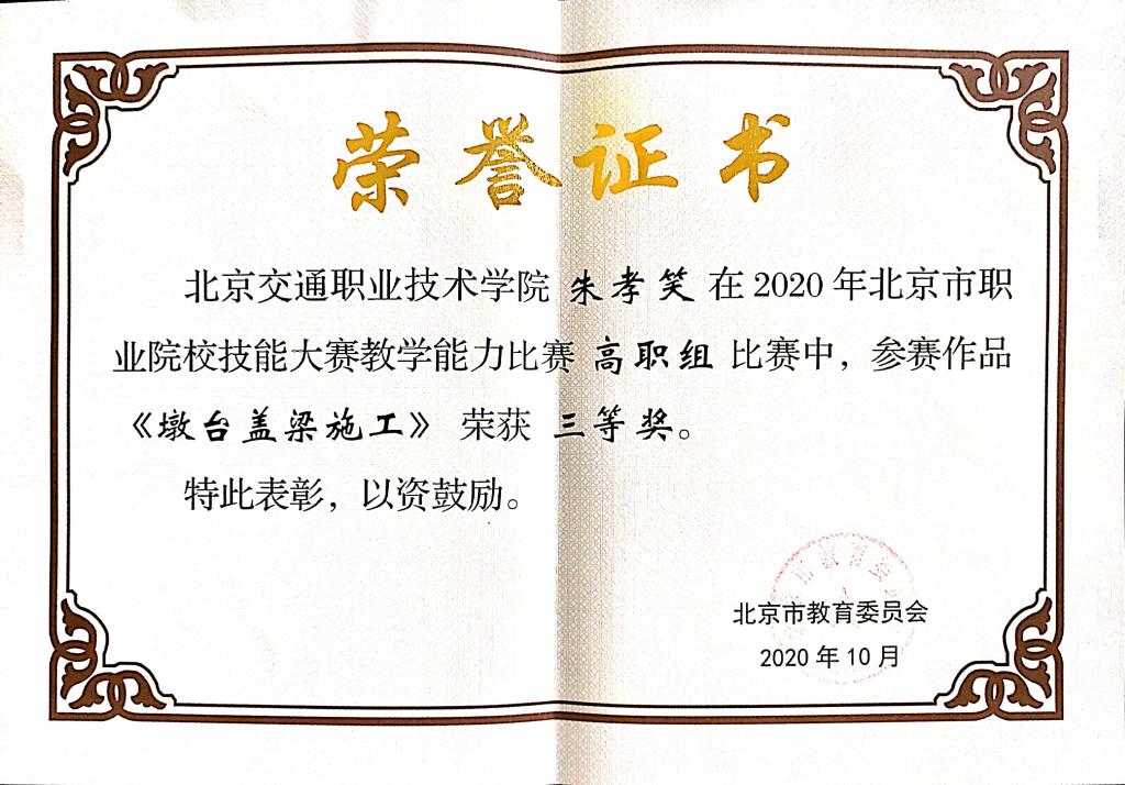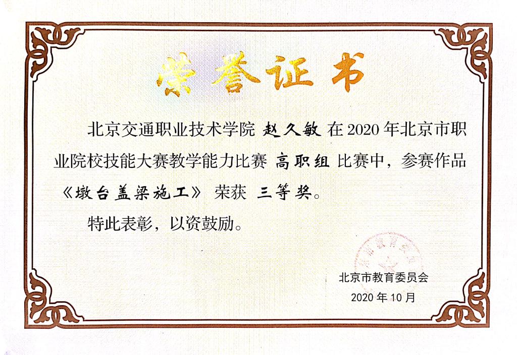 赵久敏 《桥墩盖梁施工》获2020年北京市职业院校技能大赛教学能力比赛三等奖