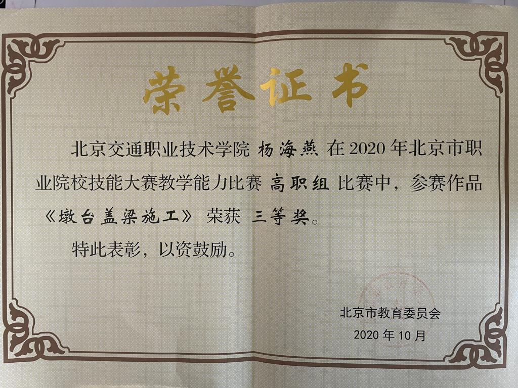 杨海燕 《桥墩盖梁施工》获2020年北京市职业院校技能大赛教学能力比赛三等奖