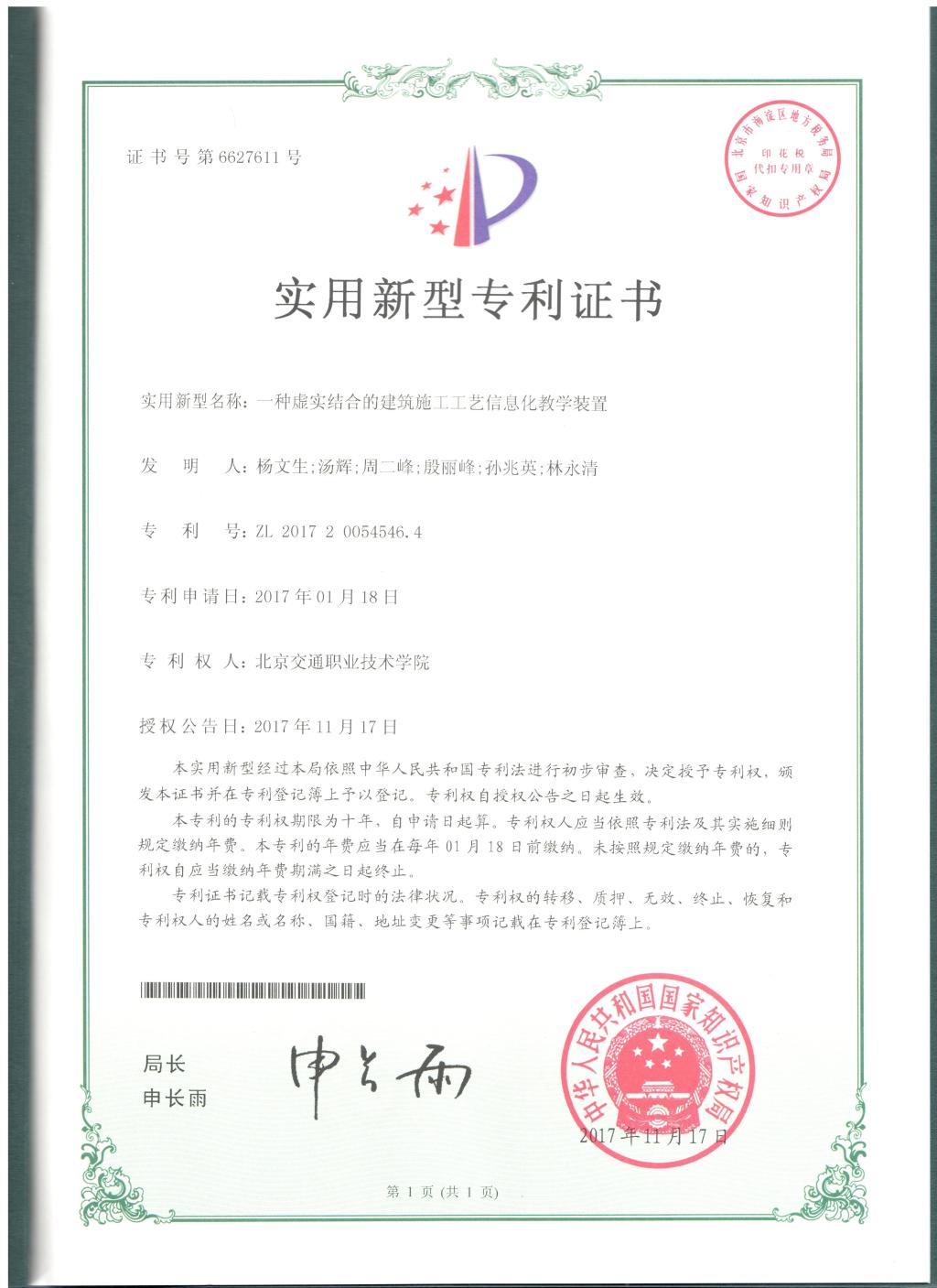 杨文生专利证书